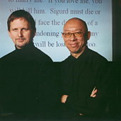 If this story is at all familiar to us today, it is probably thanks to the 19th-century German Romantics' fascination with all medieval stories and legends. We find these Eddic poems translated into German and published (by the Brothers Grimm!) already in 1815, and it is this edition, among other sources, which an industrious young composer named Richard Wagner consulted when working on the libretto for his "Ring of the Nibelung" music drama cycle, re-working and re-weaving a conflation of medieval sources and his own fertile imagination, in which Brynhild becomes Brünnhilde, Sigurd becomes Siegfried, and the terrifying apocalyptic battle between giants and gods becomes Götterdämmerung. But Wagner did not "rediscover" these stories any more than we did: 800 years ago an anonymous southern German court poet produced a hugely successful and extravagant verse retelling of the story, the "Nibelungenlied"; and not long thereafter the famously literary Icelanders themselves were re-acquianted with the whole deadly family affair through the prose "Volsunga Saga". Indeed, we are using material from this saga to fill in the gaps in the story where the Edda is silent. Sequentia and Ping Chong are in good company.